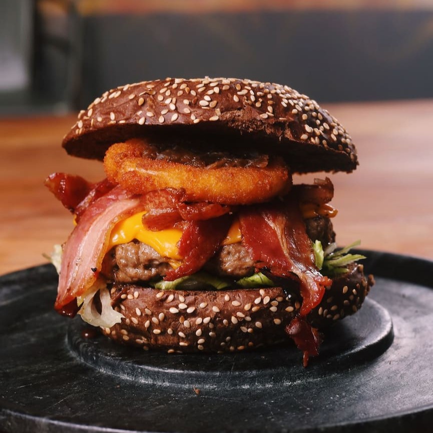 Pão australiano, burguer 180g, cebola empanada, bacon, cheddar, barbecue, cebola caramelizada e alface americana.