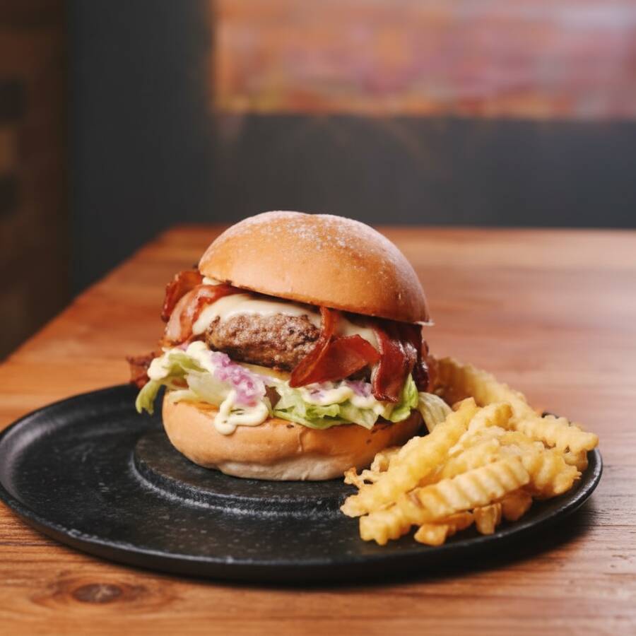 Pão ciabata, burguer 180g, bacon, Catupiry, mussarela, maionese da casa, alface americana, picles, tomate e cebola roxa. Acompanha batata crinckle e uma bebida a sua escolha.
