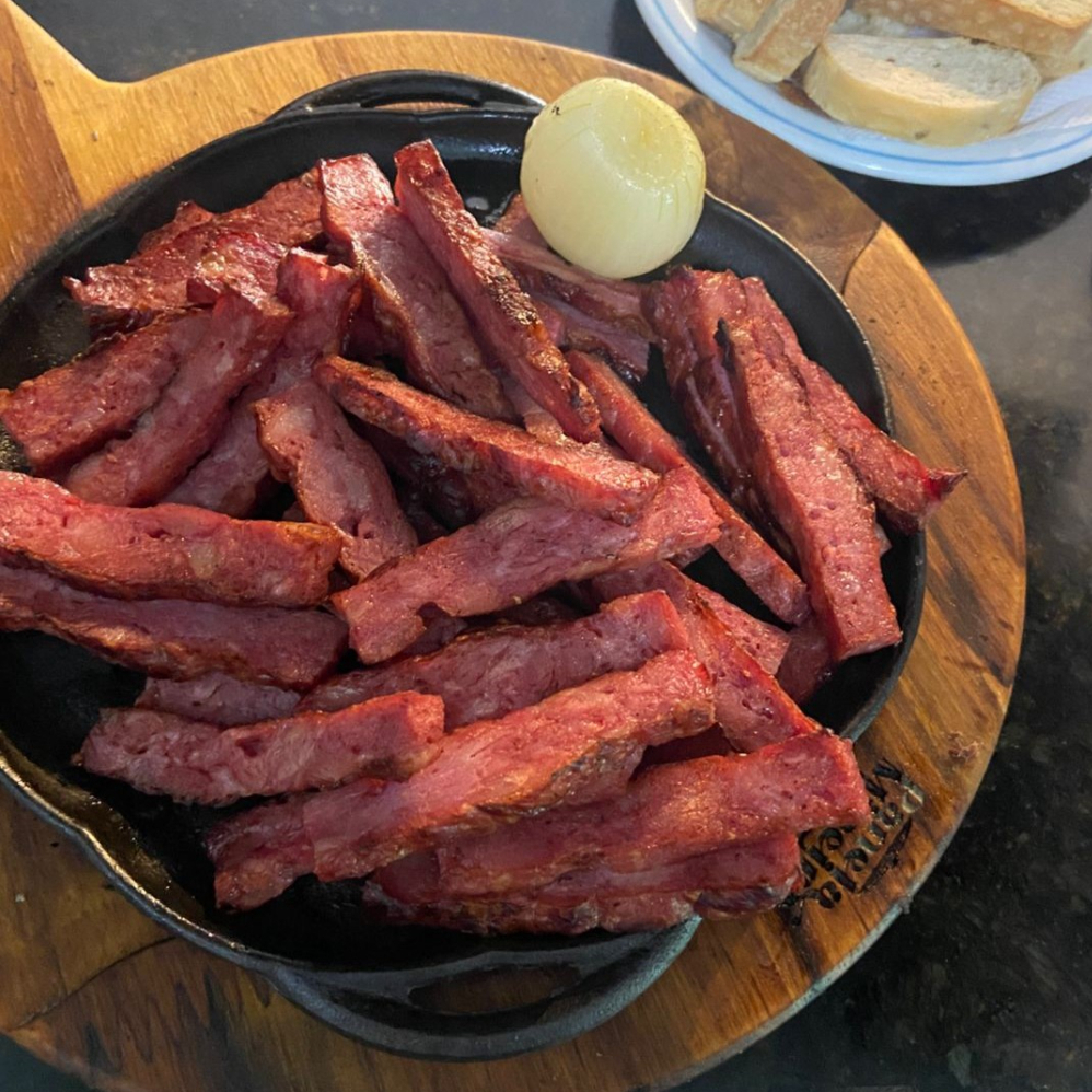 Porção de linguiça com temperos especiais da casa (250g) cortadas em aperitivo. Acompanha torradinha caseira e molho chimichurri.