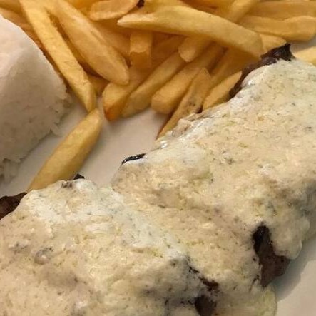200g de filé mignon bovino coberto com suave e delicioso creme de gorgonzola + 2 acompanhamentos: arroz branco, salada verde, batata frita ou batata rústica.