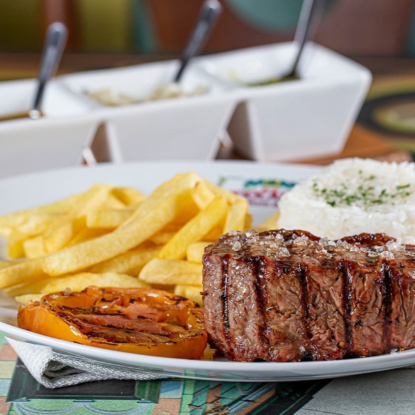 300g do exclusivo corte argentino suculento e extremamente macio + 2 acompanhamentos: arroz branco, salada verde, batata frita ou batata rústica.