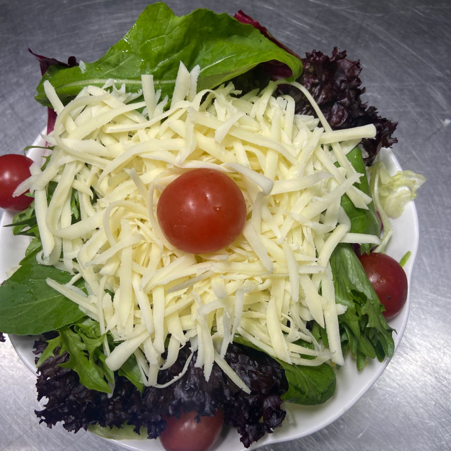Salada de folhas selecionadas, alface americana, alface roxa, rúcula, tomate e lascas de queijo provolone.