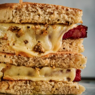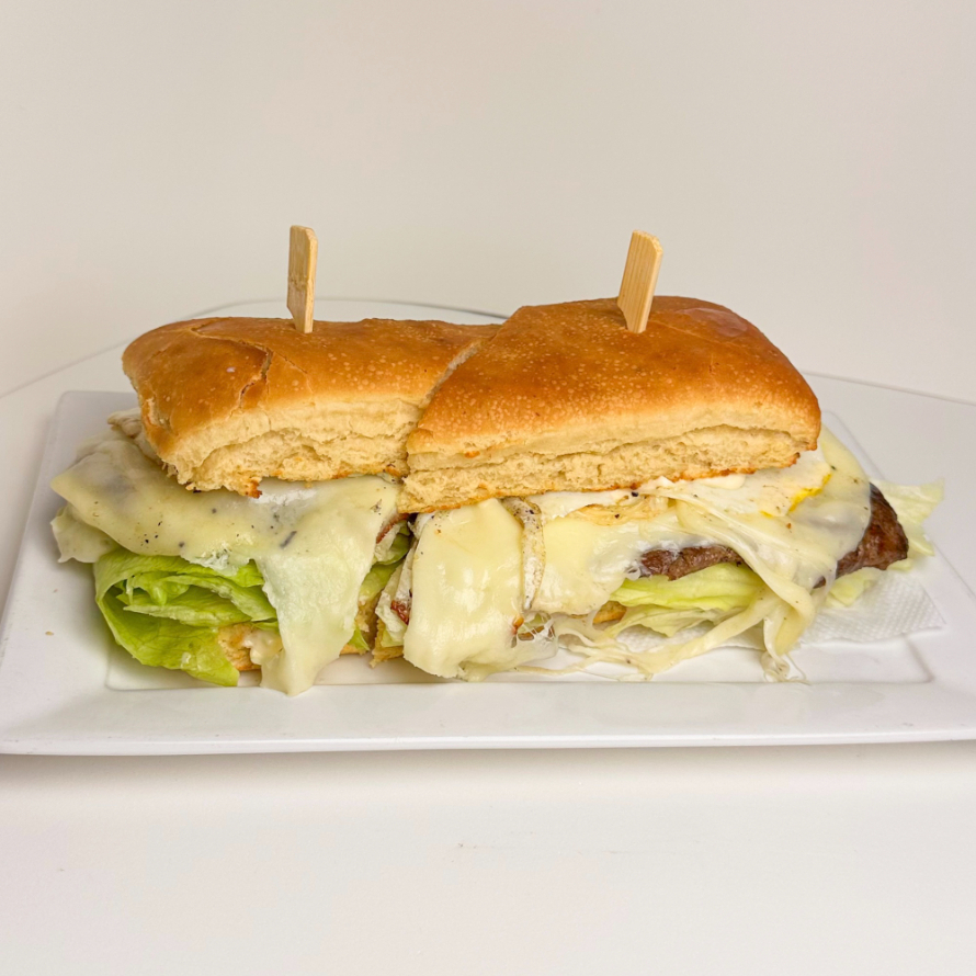 Sanduíche argentino com filé mignon, alface, tomate, mussarela, ovo, maionese e pão caseiro.