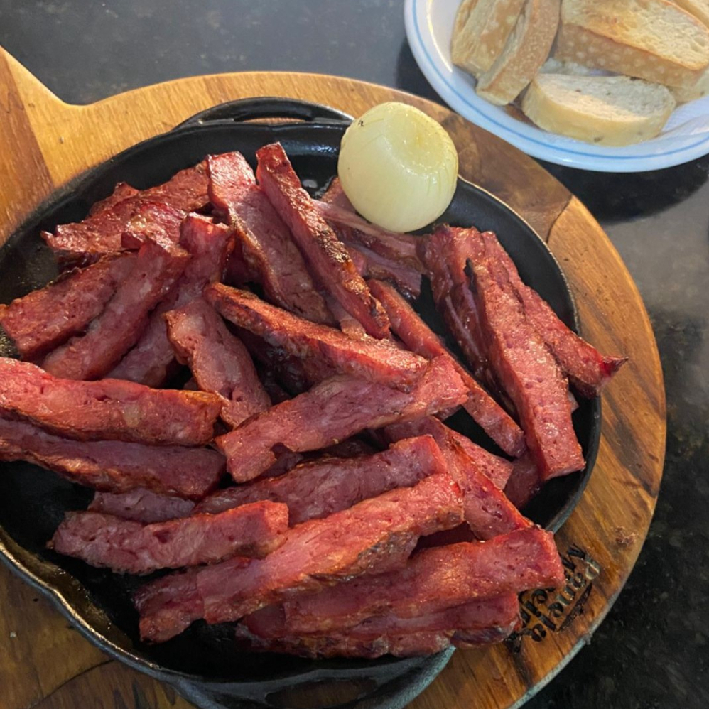 Porção com 2 unidades da nossa incrível linguiça artesanal de sangue de porco, acompanha torradinha caseira e molho chimichurri.