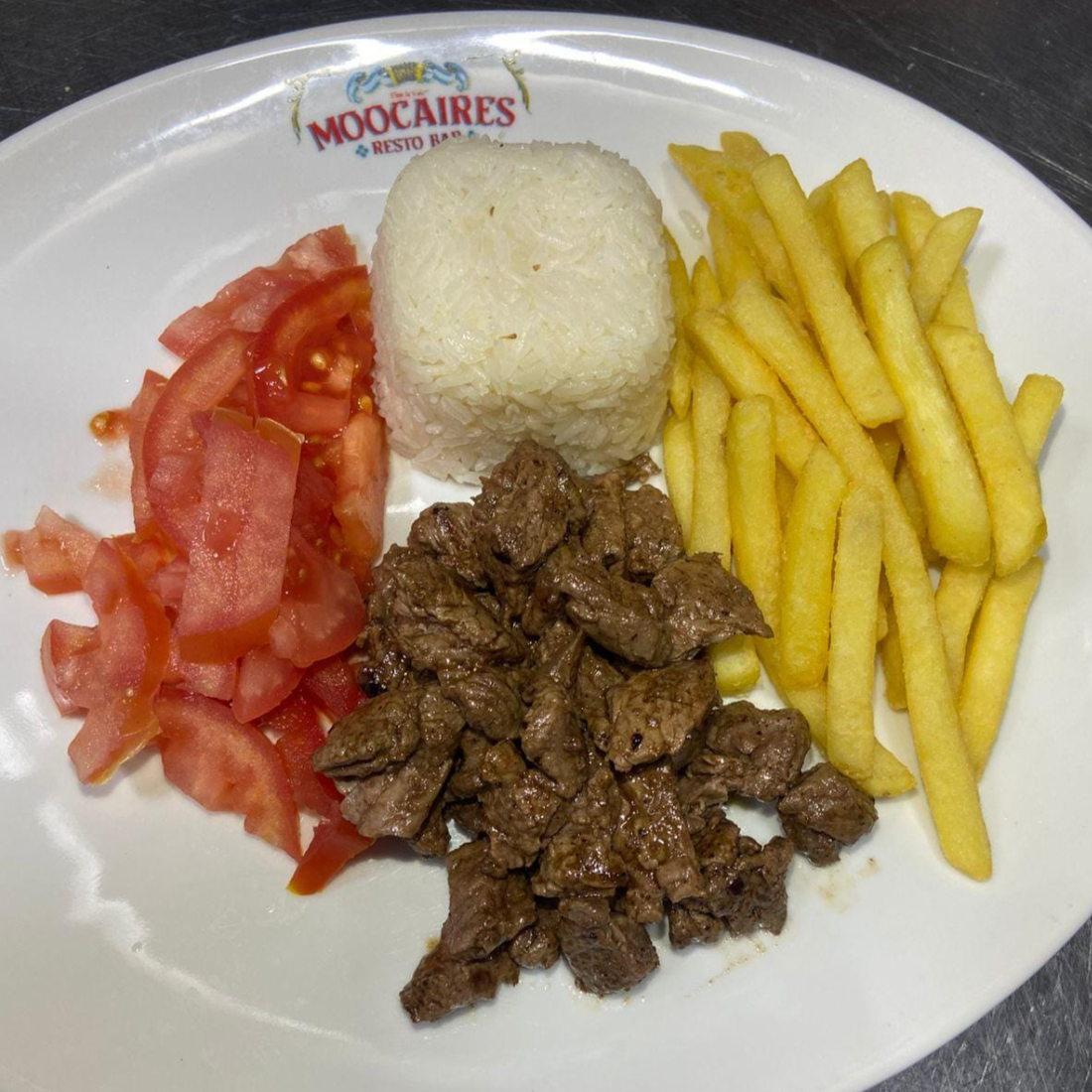 File mignon em cubinhos, arroz branco, tomate e papas fritas!