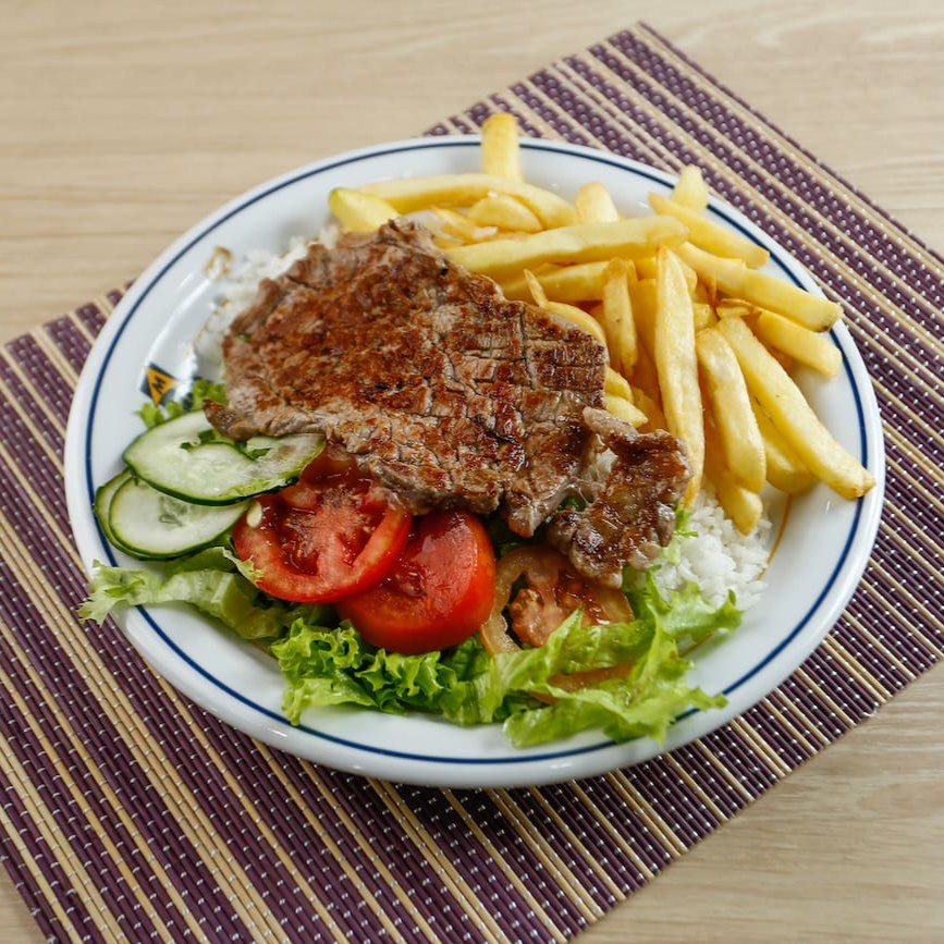Contra filé, fritas, salada e arroz.