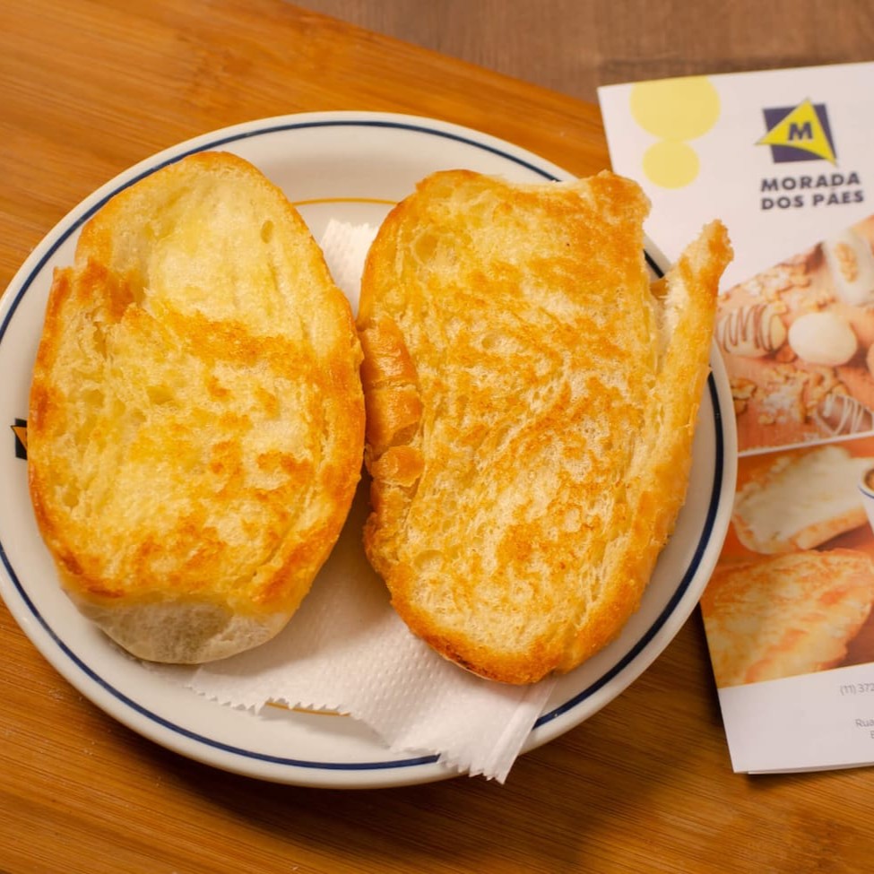 Baguete na chapa com requeijão. (Na entrada é quando o requeijão é passado no pão antes de ir para a chapa e fica com aquela camada torradinha deliciosa. E saída é quando ele é passado após o pão sair da chapa)