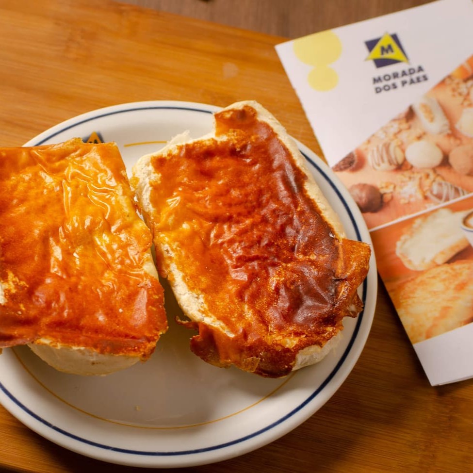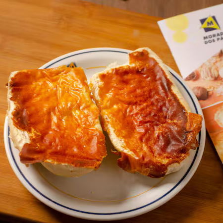 Pão francês na chapa com requeijão. Na entrada é quando o requeijão é passado no pão antes de ir para a chapa e fica com aquela camada torradinha deliciosa. E saída é quando ele é passado após o pão sair da chapa)
