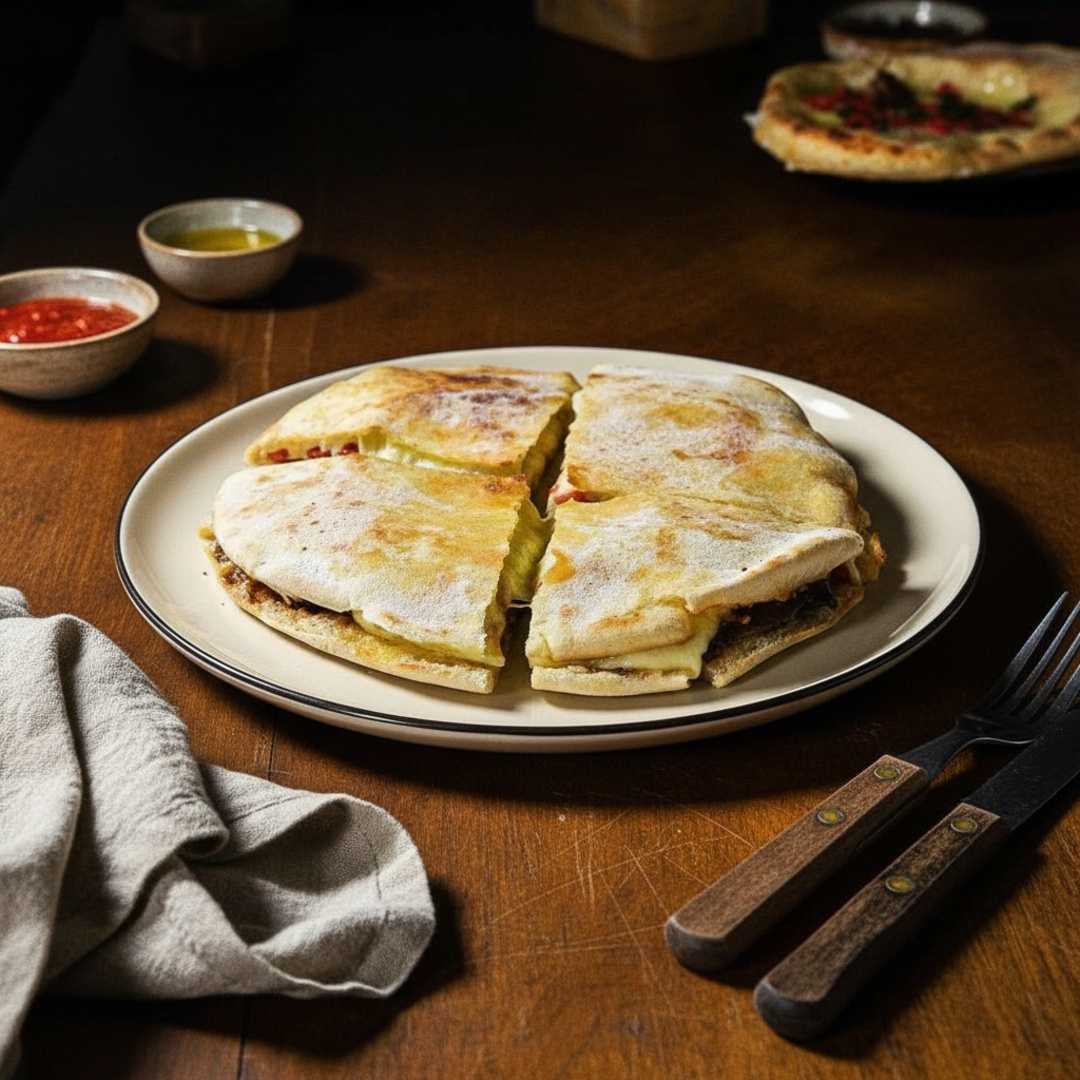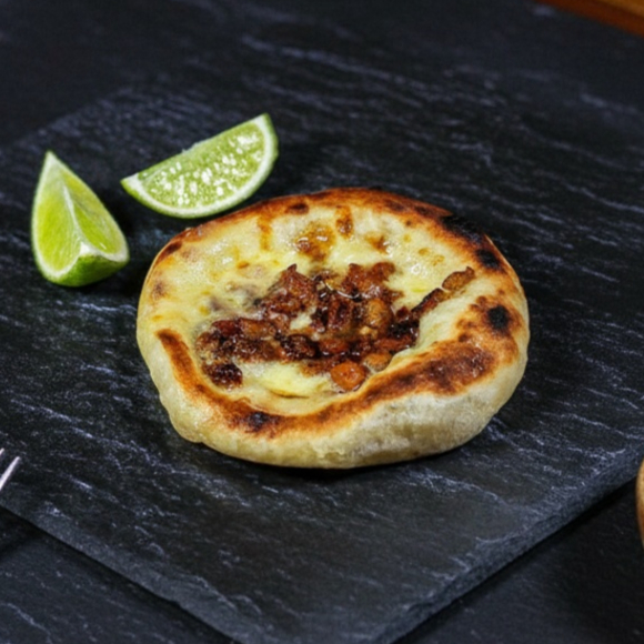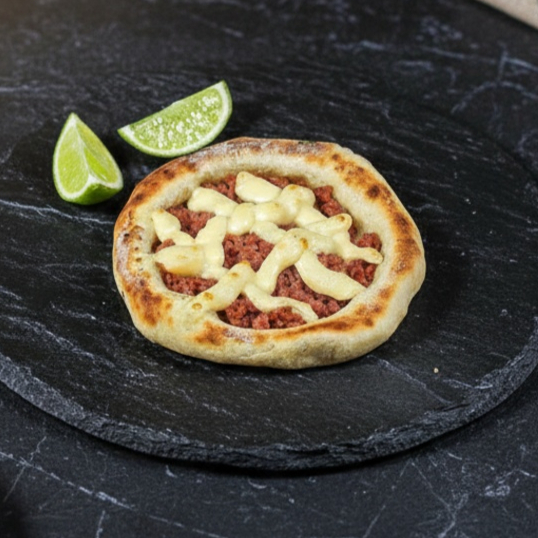 carne temperada com especiarias árabes no pão sírio artesanal, muçarela e tomate.