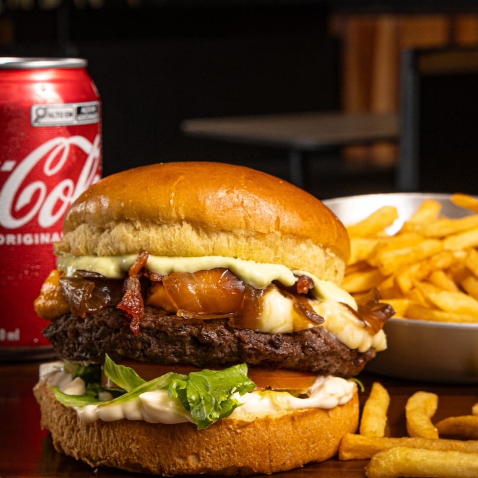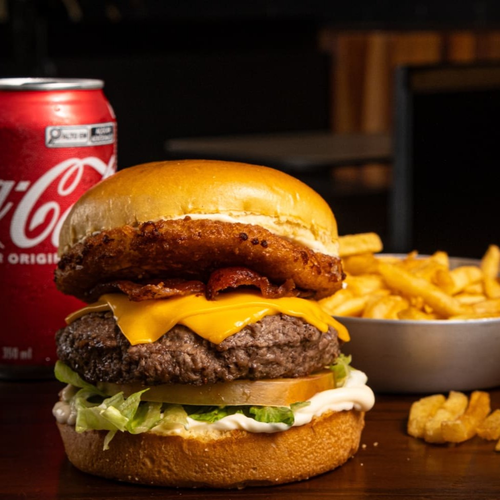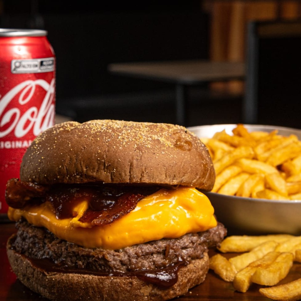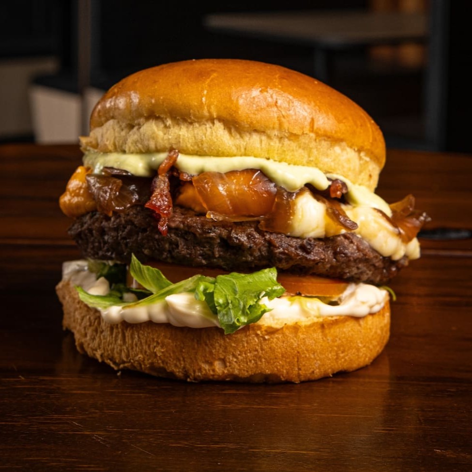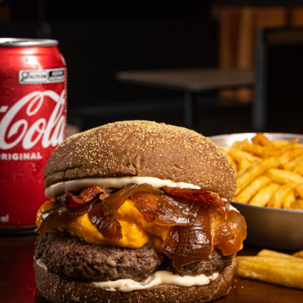Pão australiano, hambúrguer, creme cheddar, cebola caramelizada, bacon e maionese.