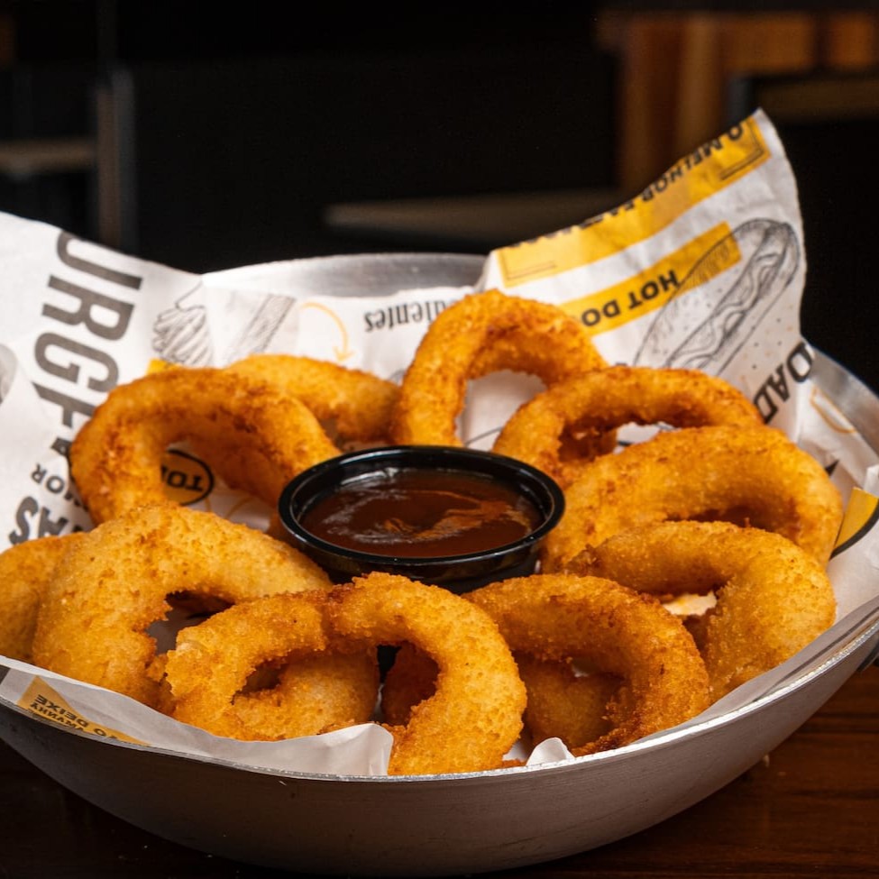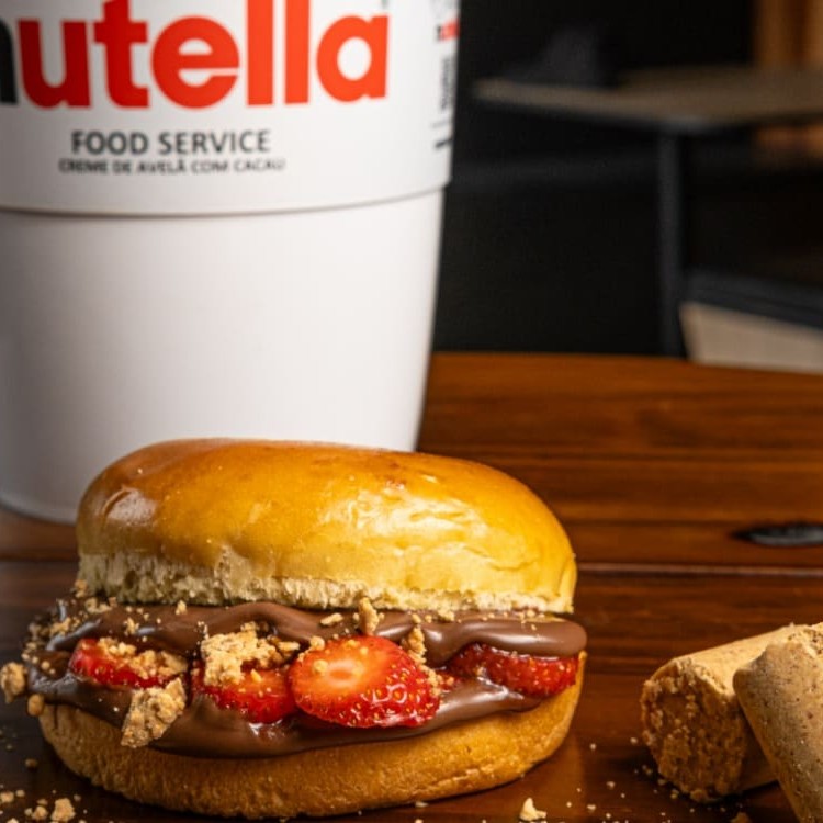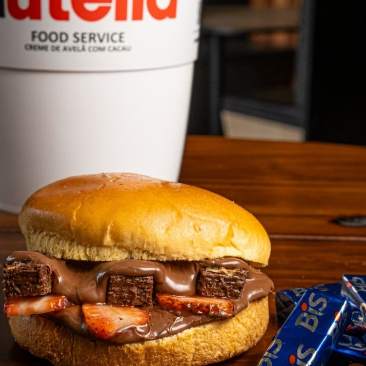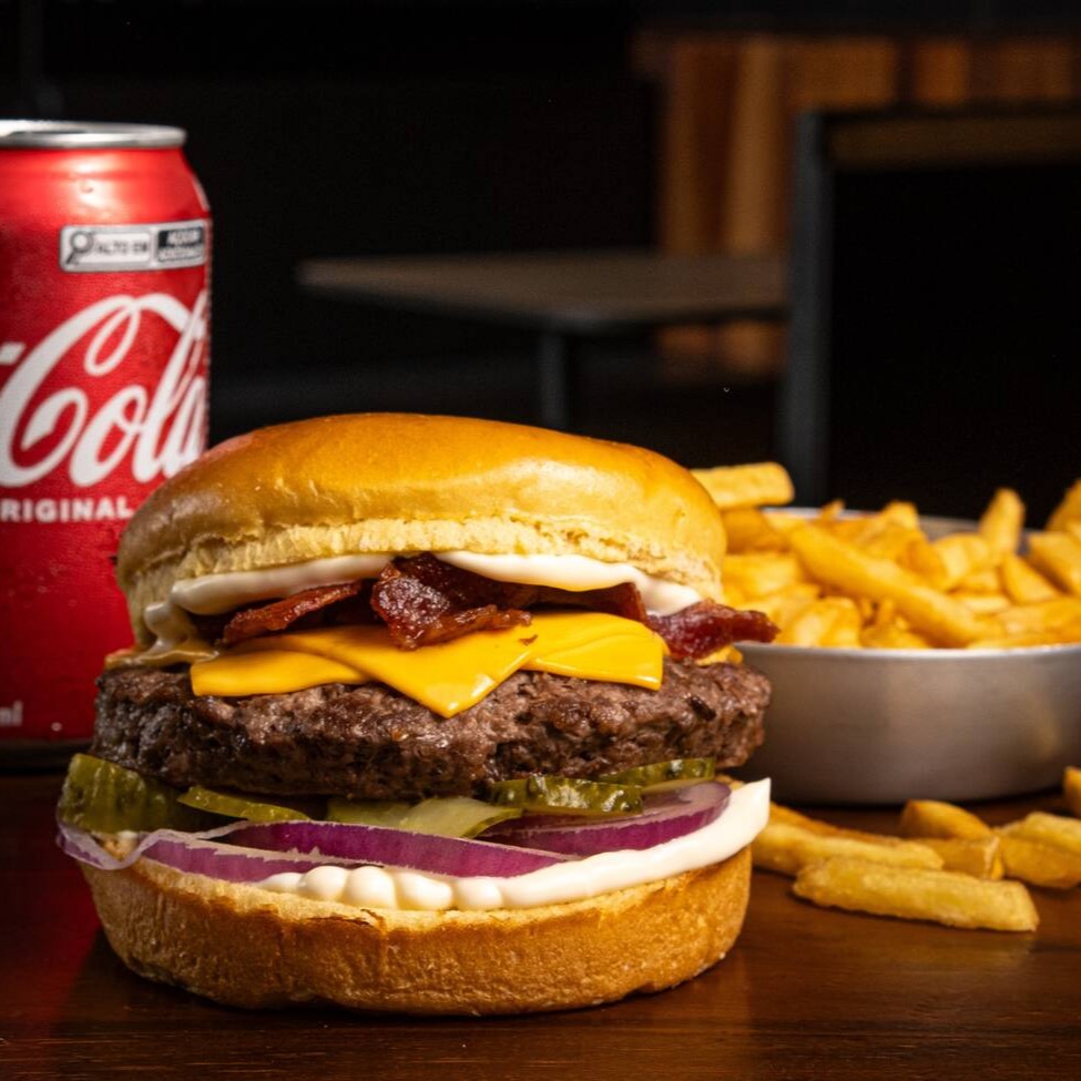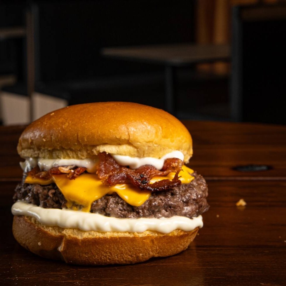 Pão australiano, hambúrguer, creme cheddar, cebola caramelizada, bacon e maionese.