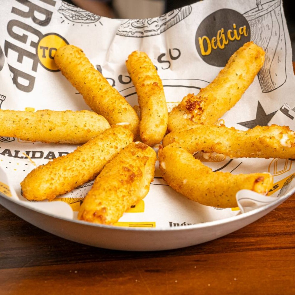 Pão brioche, hambúrguer , maionese, 3 Un de mussarela empanada, bacon, cheddar em fatia, alface e tomate.