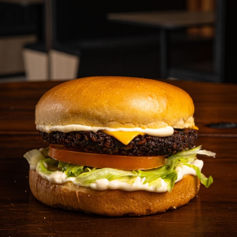 Pão brioche, hambúrguer de faláfel, maionese cheddar em fatia, alface e tomate .