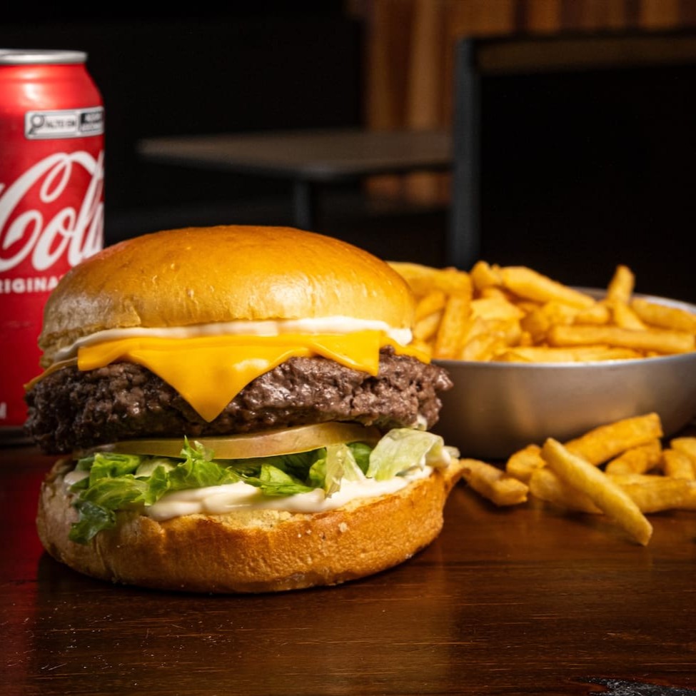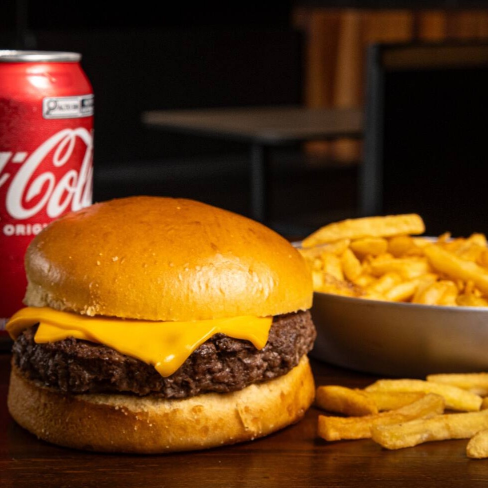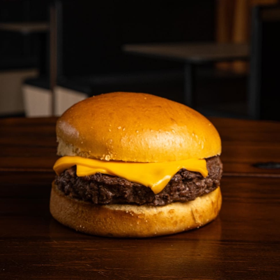 Pão brioche, hambúrguer, cheddar, maionese, alface e tomate.