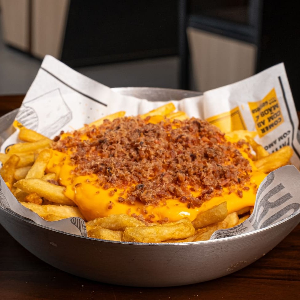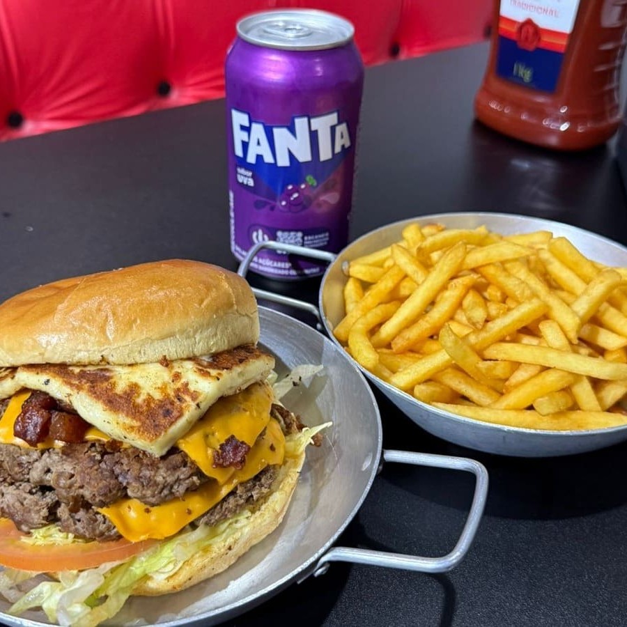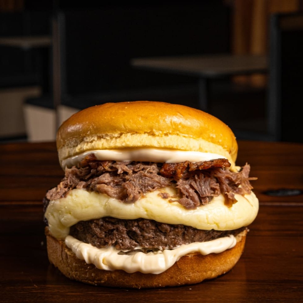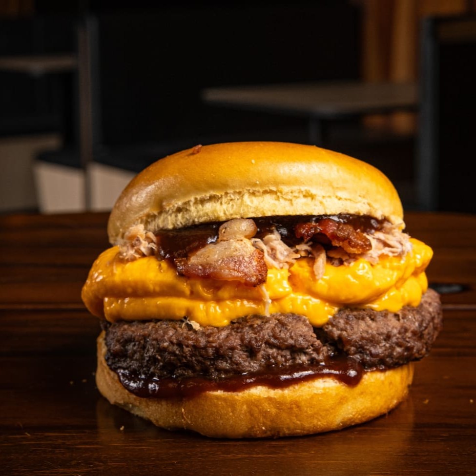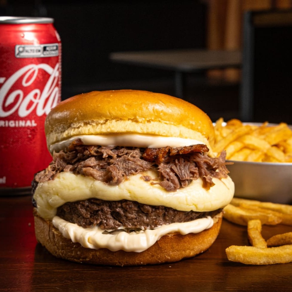 Pão brioche, barbecue , hamburguer, cheddar cremoso, bacon e pernil desfiado.