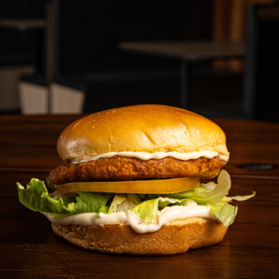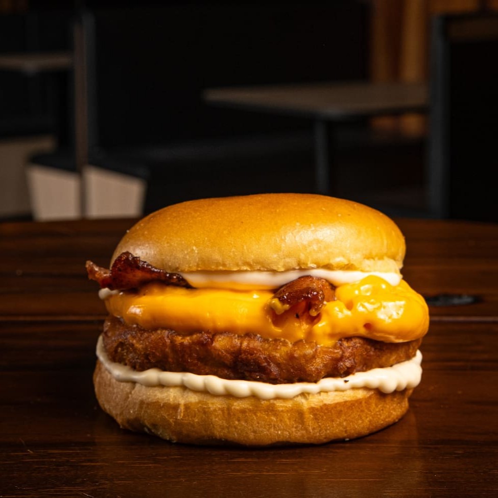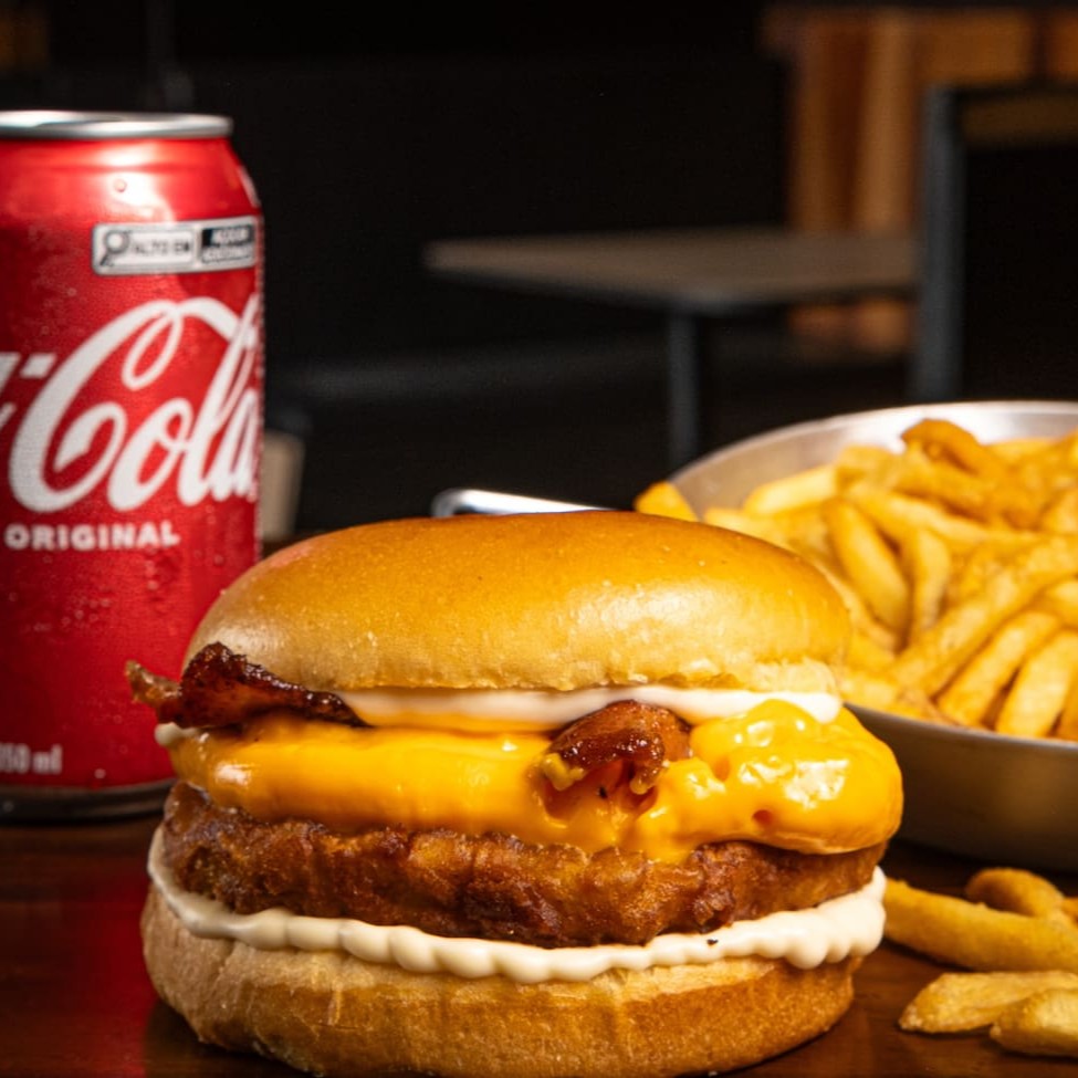 Pão brioche, 100g de frango empanado, maionese, cheddar cremoso, bacon.