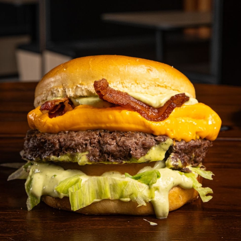 Pão brioche, hambúrguer , cheddar, bacon, alface, tomate e molho verde.