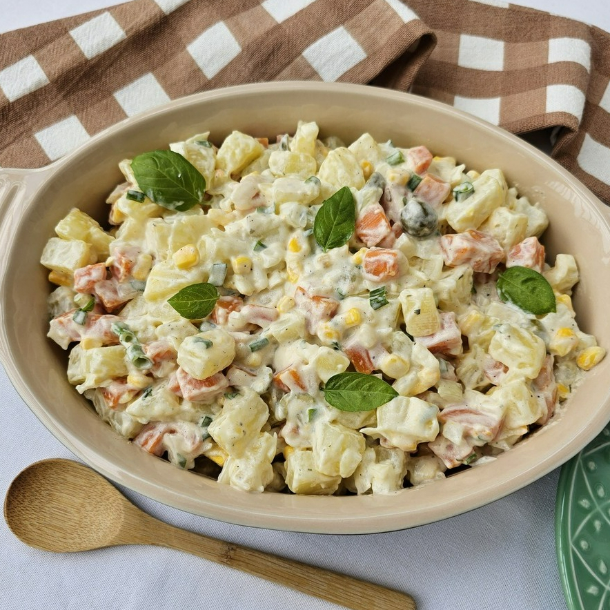 Deliciosa salada de maionese caseira , com batatas , cenoura , vagem e cebolinha