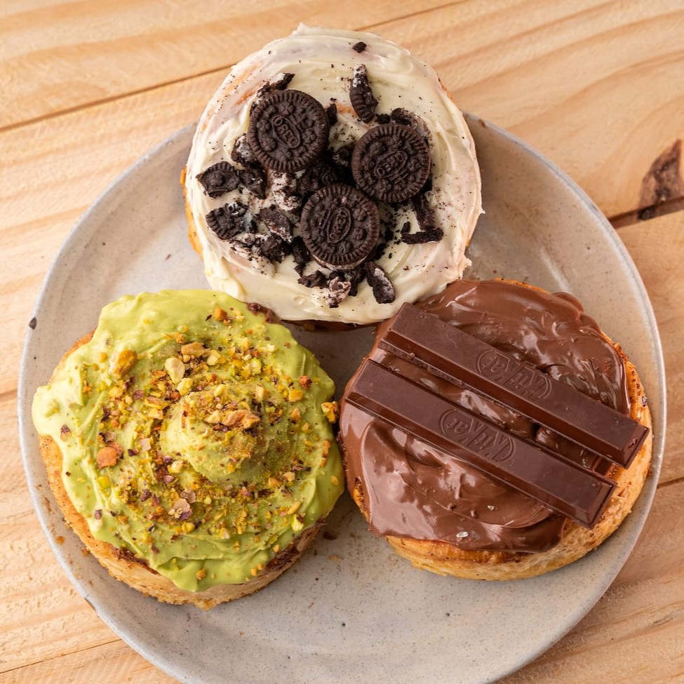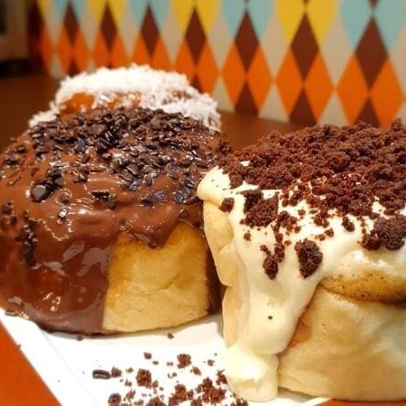 Massa de pão enrolada em canela e açúcar, coberta com cream cheese e calda de chocolate e caramelo.