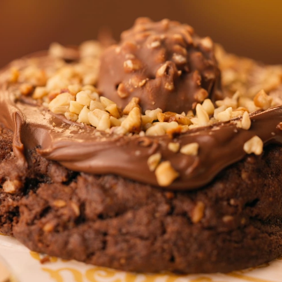 Cookie de chocolate com pedaços de avelã, coberto com Nutella, castanha de cajú e o incrível bombom Ferrero Rocher.
