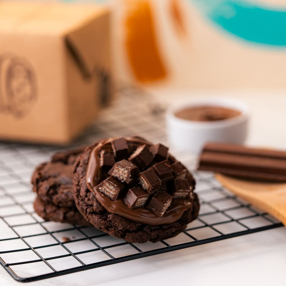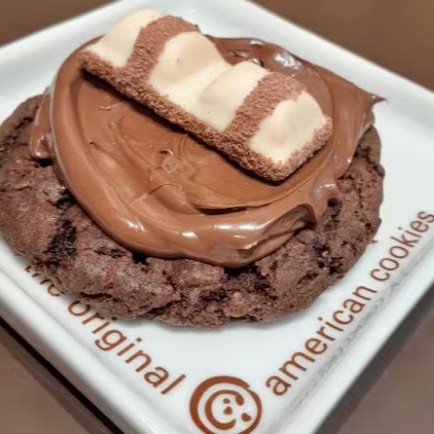 Não satisfeito apenas com o cookie, ele foi lá e deixou tudo melhor. Saboroso cookie duplo com cobertura de creme de avelã e Kit Kat dark. É o bom que ficou ainda melhor.