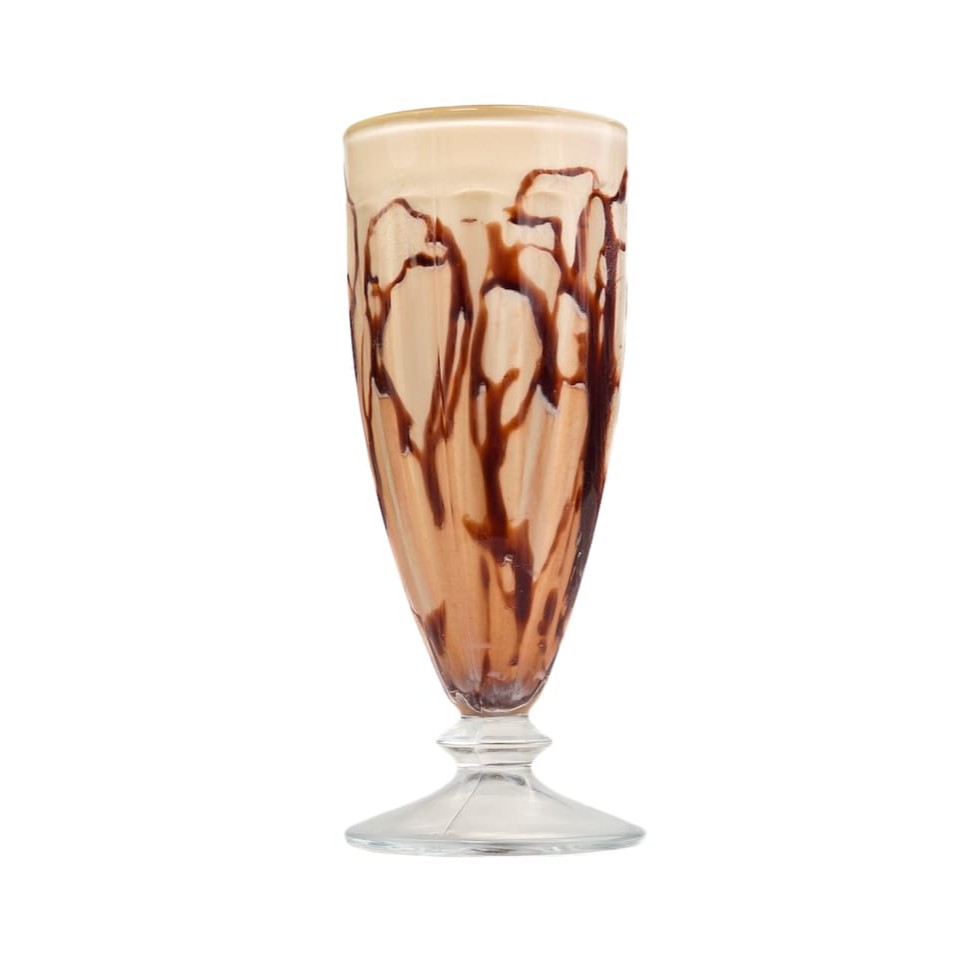 A cremosidade gelada e deliciosa: Leite integral alto padrão, chocolate do padre Nestlé 50% de cacau batido com gelo e calda de chocolate.