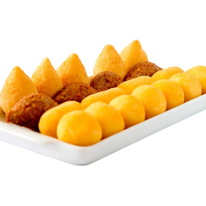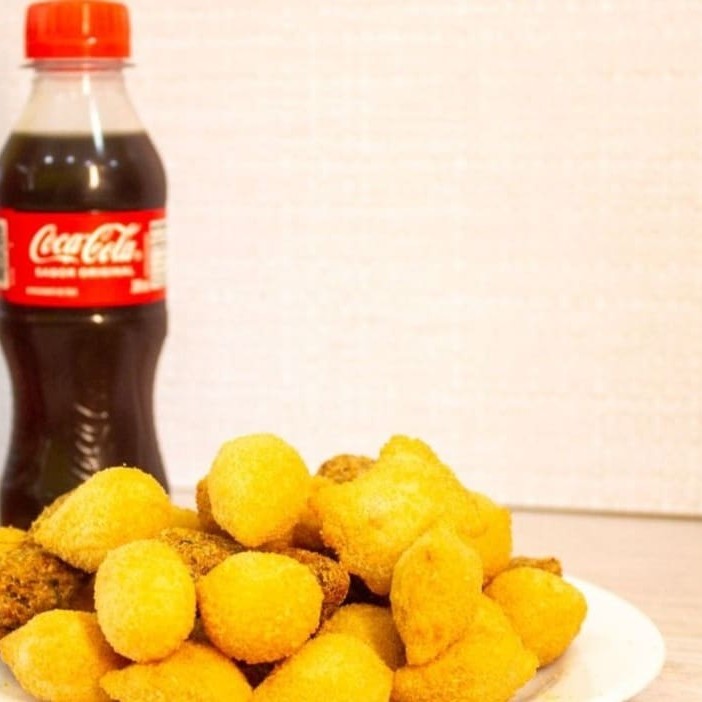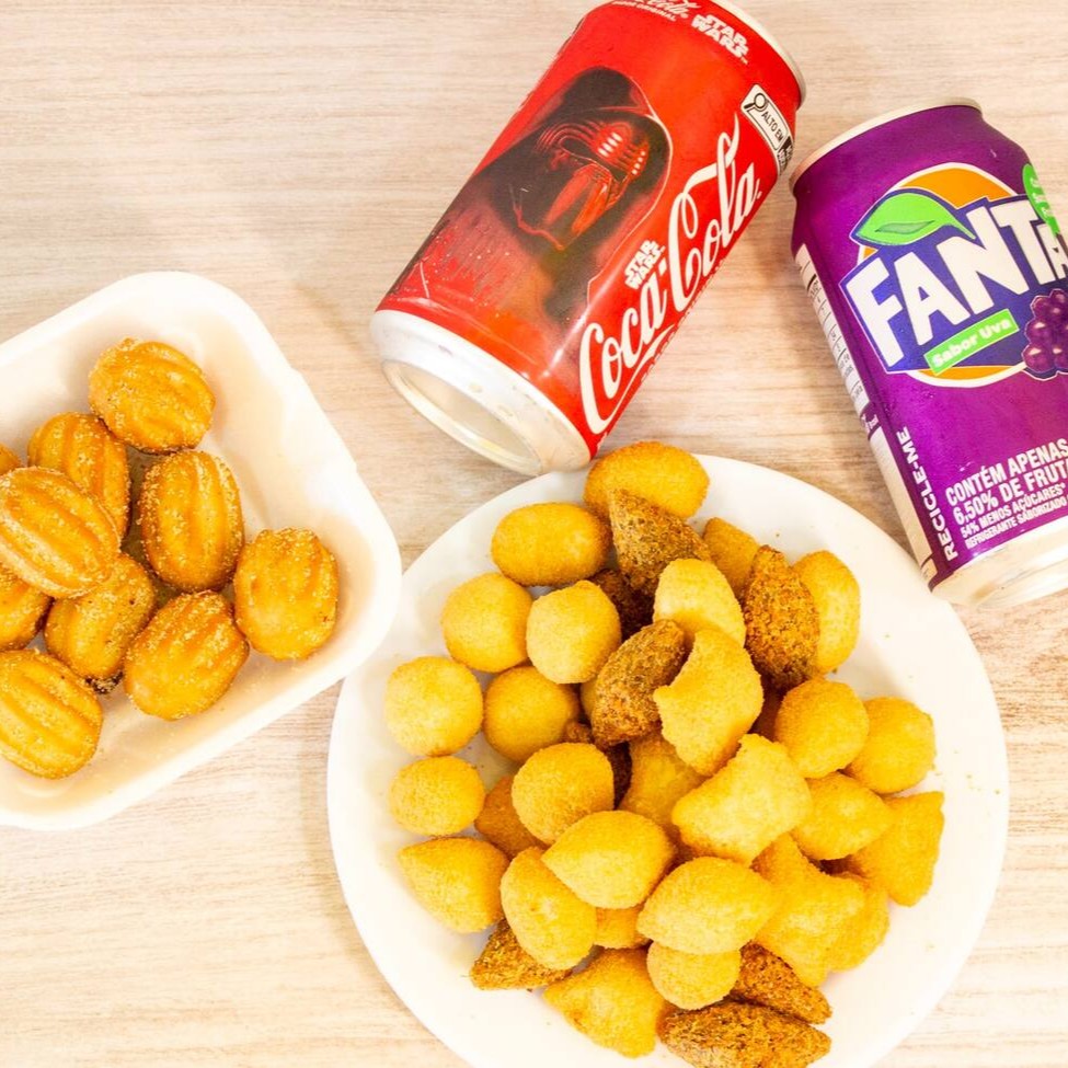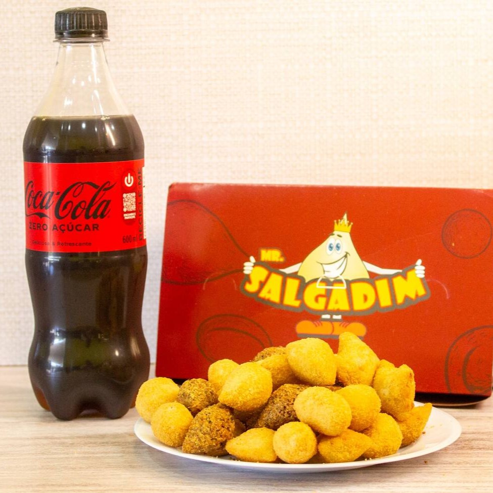 100 mini salgados com 8 gramas cada. 1 Coca-Cola 600ml. **A imagem não representa a quantidade**