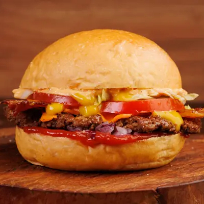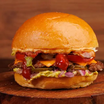 Pão brioche, carne 100g, maionese da casa, bacon, queijo cheddar, queijo provolone, alface, molho da casa, tomate, cebola, picles e molho barbecue.