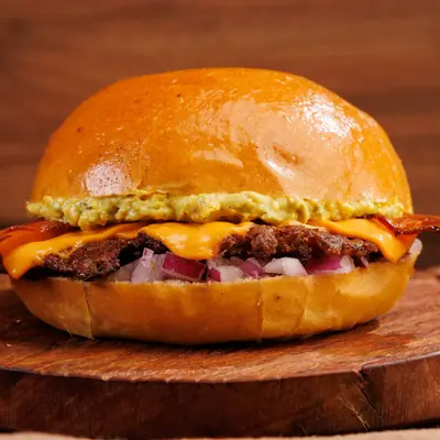 Pão brioche, 1 carne 100g, queijo cheddar, bacon em tiras, maionese da casa, cebola roxa picada.