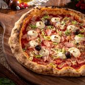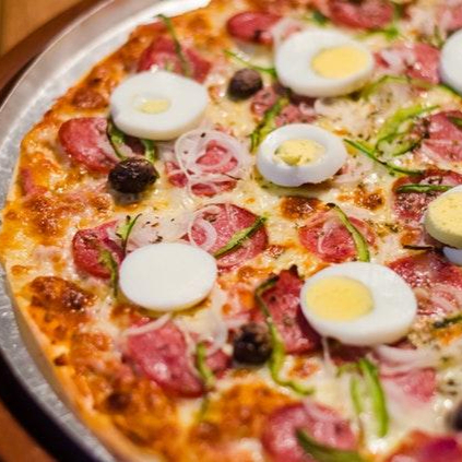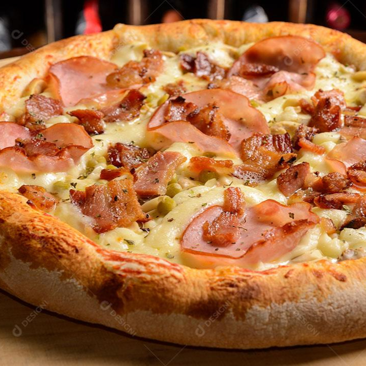 MOLHO DE TOMATE, PRESUNTO, CALBRESA, OVO, ERVILHA, CEBOLA, MUSSARELA E BACON.