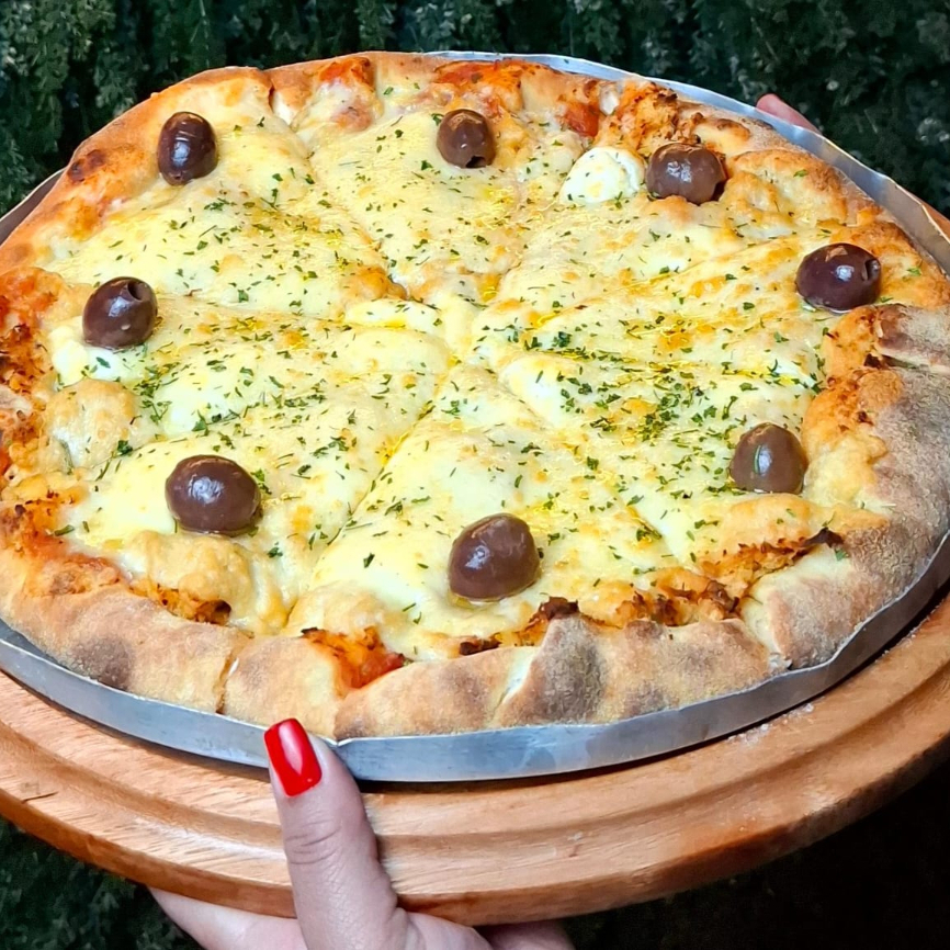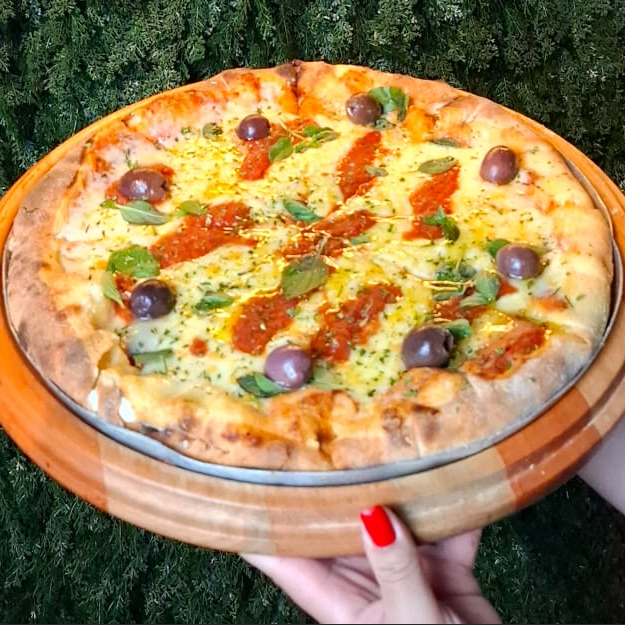 MOLHO, MUSSARELA, MOLHO DE TOMATE ARTESANAL E MANJERICÃO.