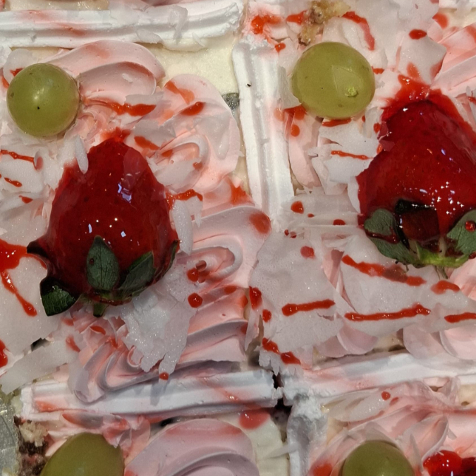FATIA DE BOLO GELATO, COM RECHEIO DE MOUSSE DE CHOCOLATE C/ MORANGO.