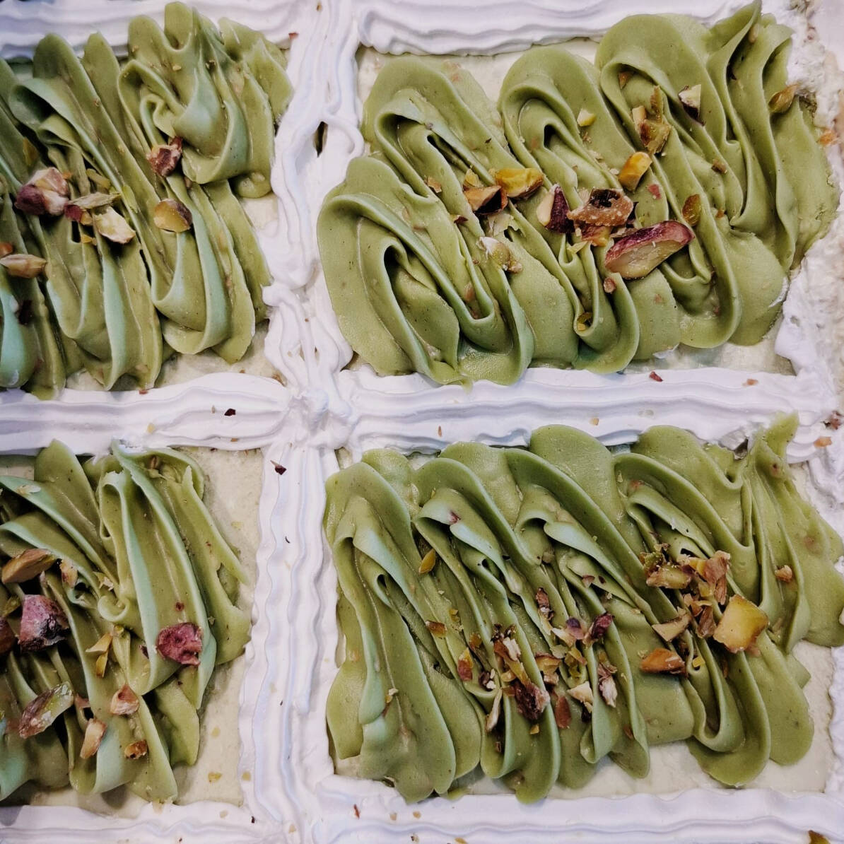 FATIA DE BOLO GELADO, COM DELICIOSO RECHEIO DE PISTACHE