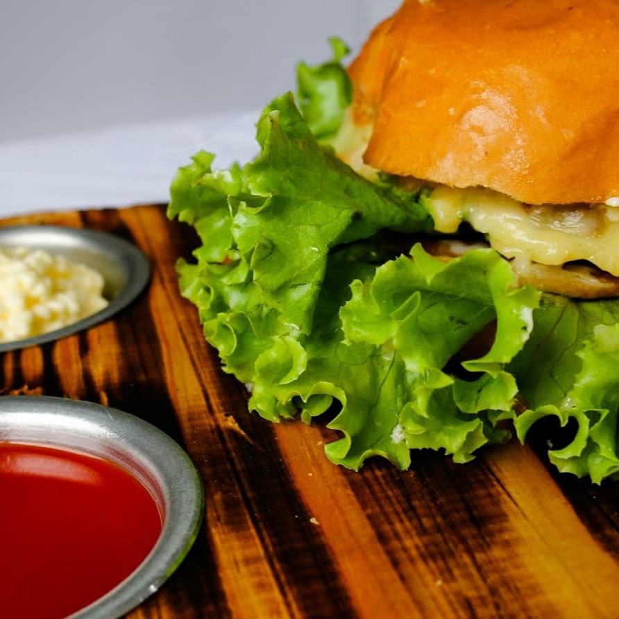 Hamburguer, queijo, salada, maionese e pão