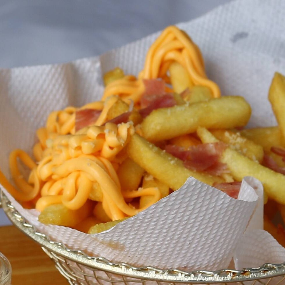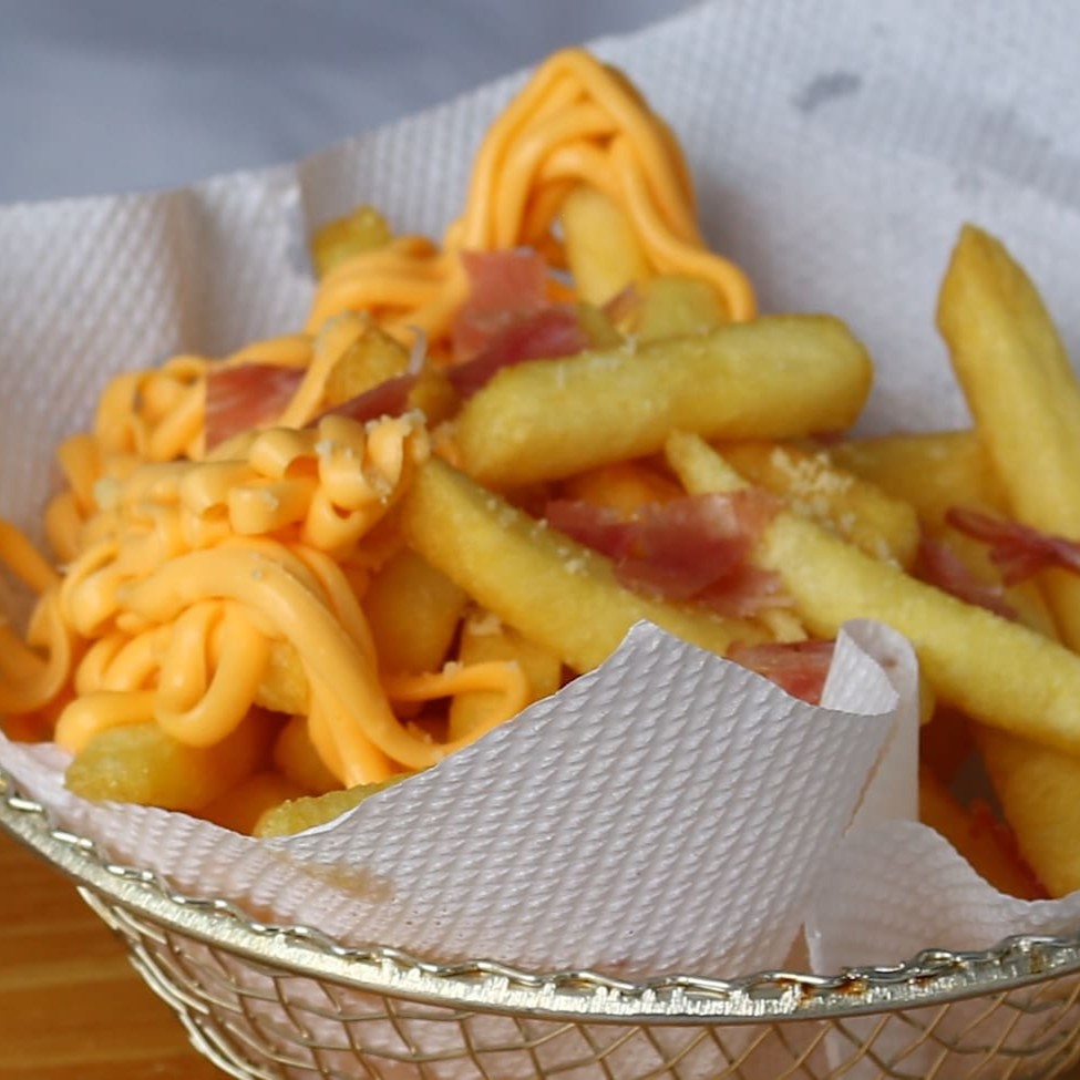 Batata frita palito com bacon.
