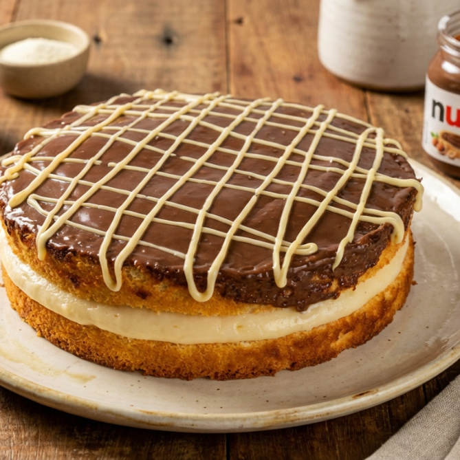 🤍🍫 O queridinho que vende todos os dias! Bolo de massa branca leve e macia, recheado com um creme irresistível de Leite Ninho. Finalizado com cobertura generosa de Nutella e fio de Leite Ninho por cima. Perfeito para quem ama essa combinação clássica e super cremosa!