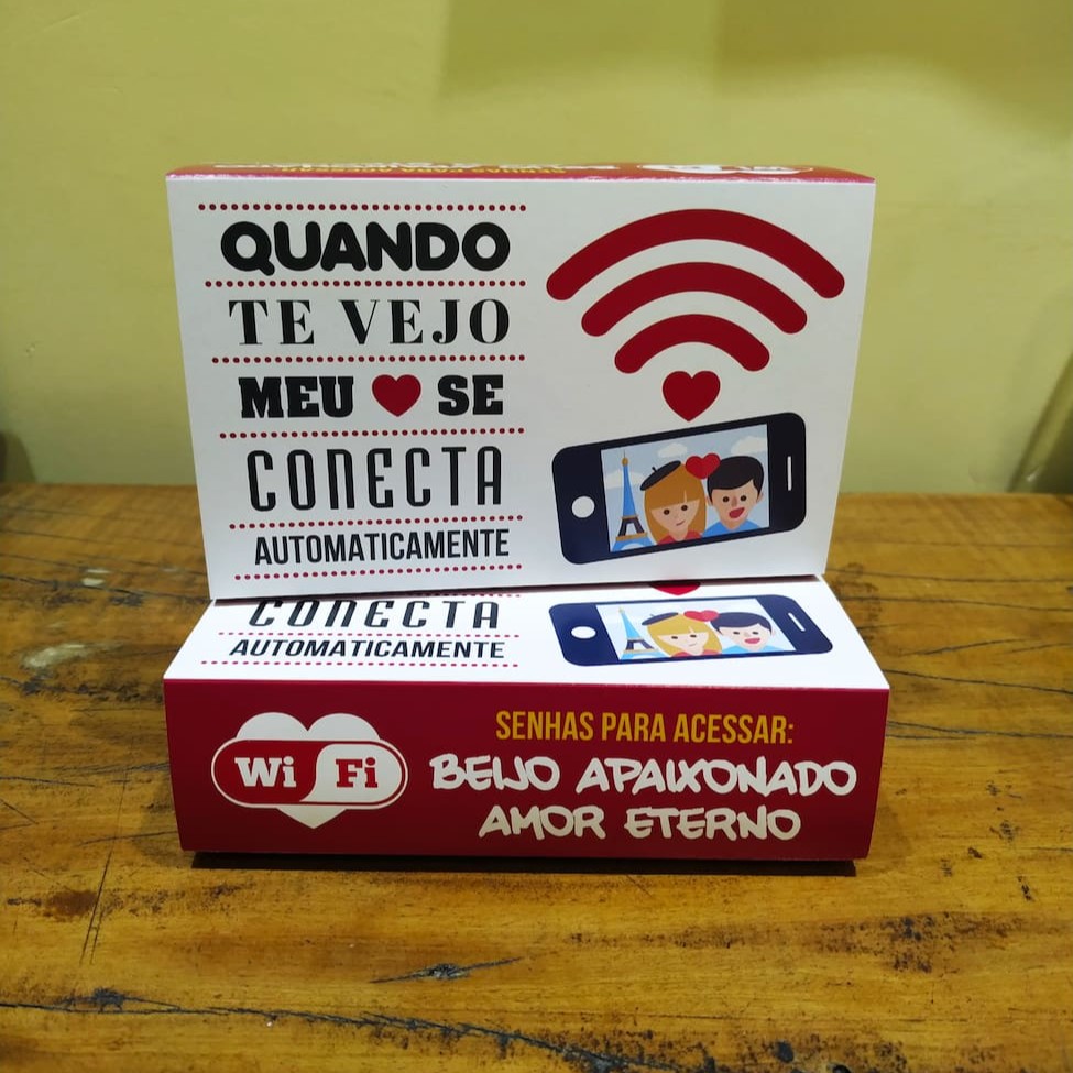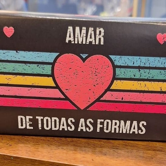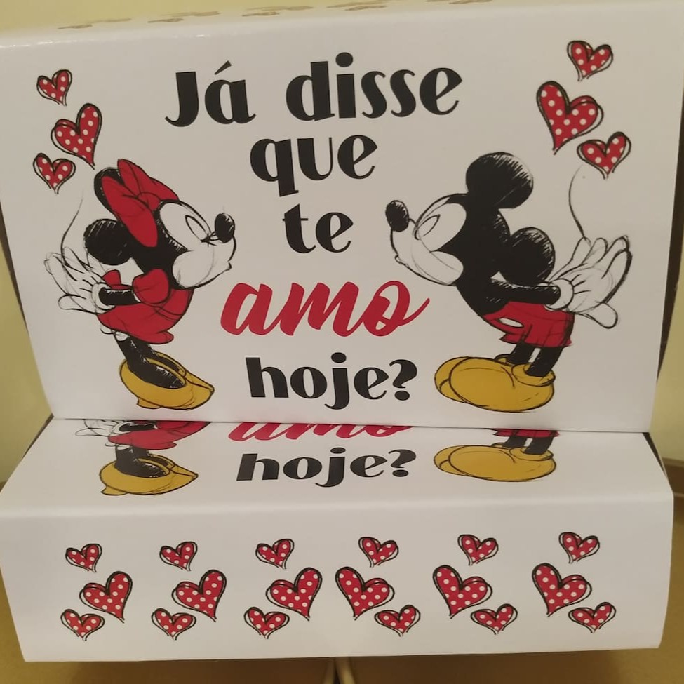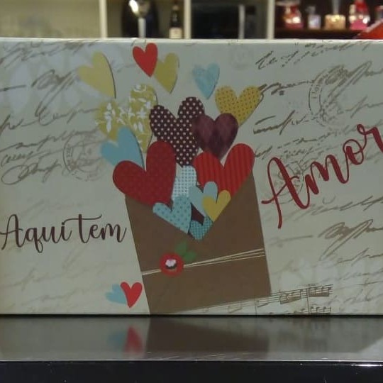 "Caixa com uma placa de chocolate ao leite com frase escrita em chocolate branco ""amo você""."