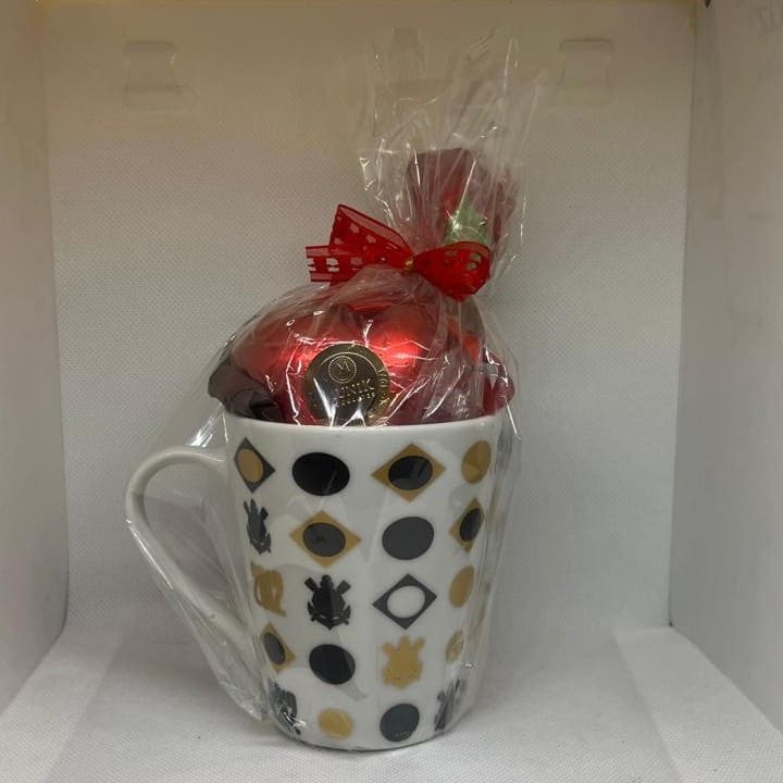 Caneca em porcelana do Corinthians contém 1 tulipa de chocolate ao leite e 1 coração de chocolate ao leite
