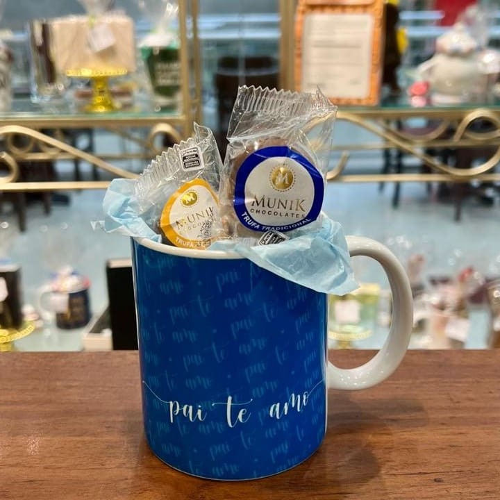 Caneca azul Te amo pai meu exemplo - contém 4 trufas soft sortidas e 1 pão de mel de licor.