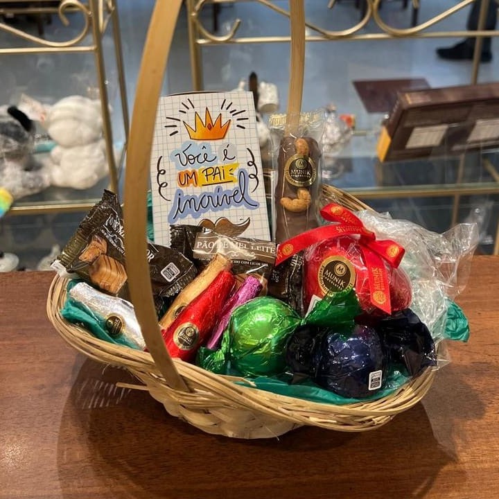 Cestinha do Dia dos pais contém: 1 caixinha com 4 trufas soft, 4 garrafinhas de licor, 1 pão de mel de leite, 1 pão de mel de licor, 1 coração de chocolate, 1 trufa cremosa de maracuja, 1 trufa cremosa coco, 1 barra de caju.