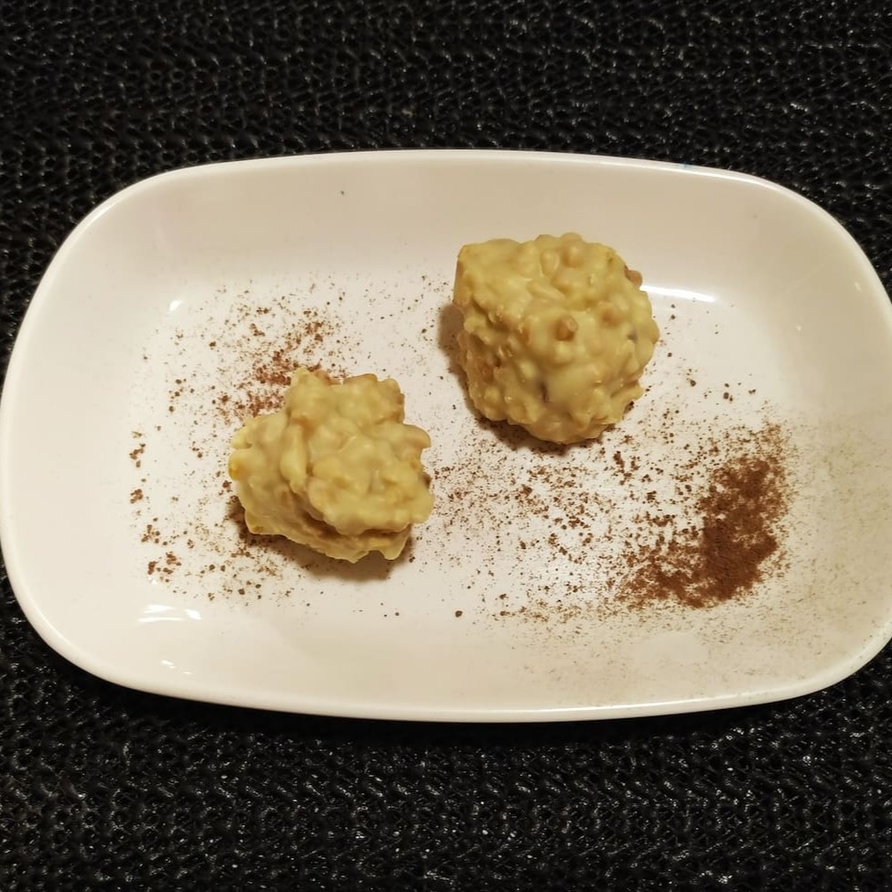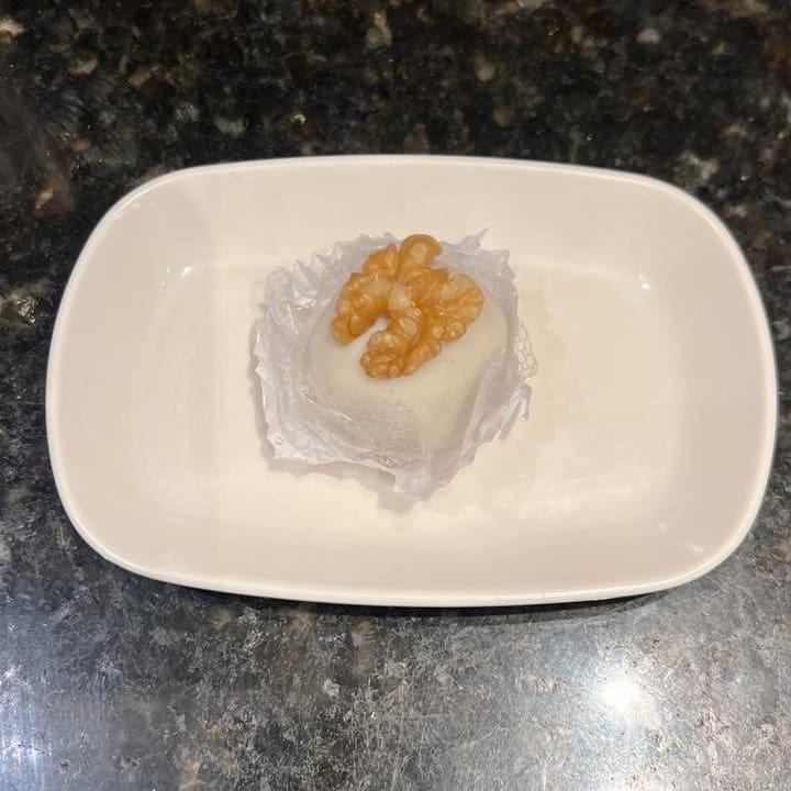 Docinho com massa de nozes, glaceado e é decorado com uma ¼ de noz.