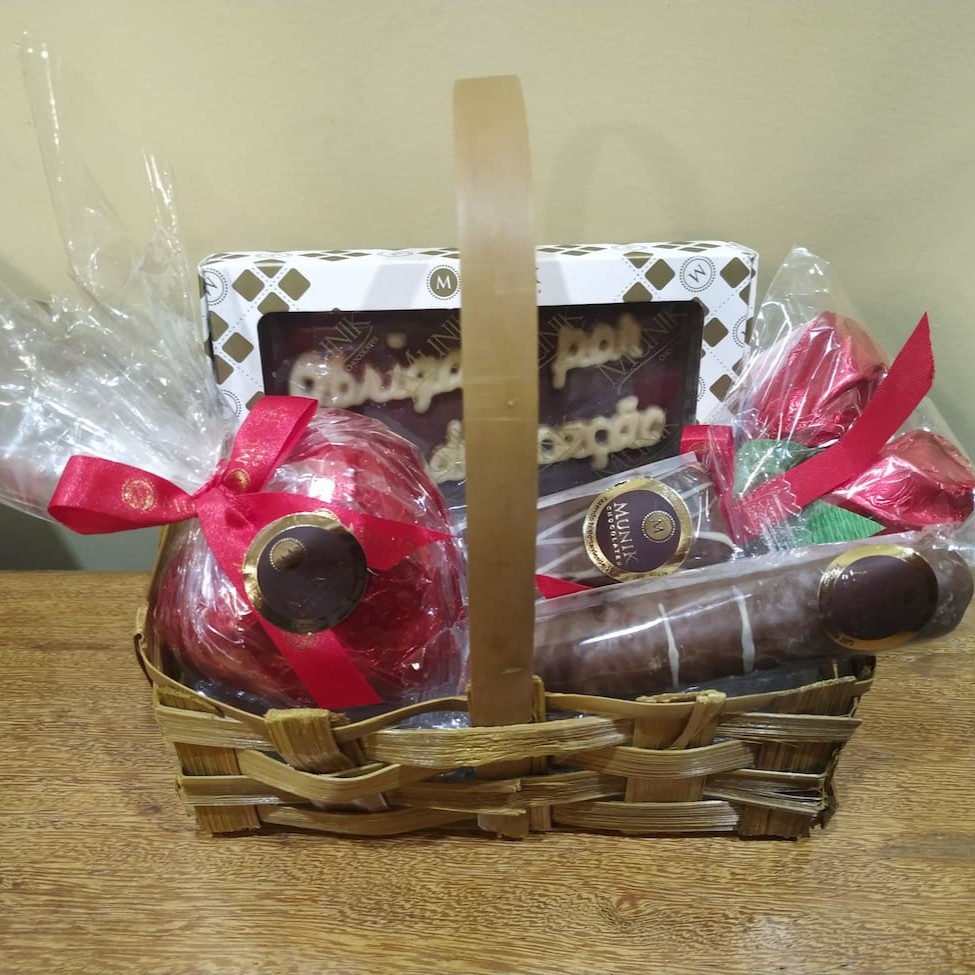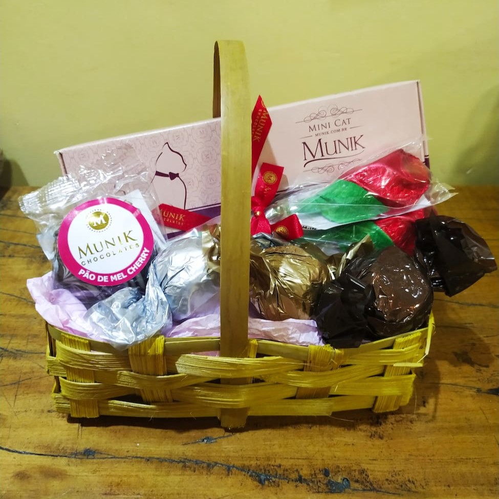 Cesta pequena com 1 caixa de linguá de gato mista (ao leite e chocolate branco) + 3 trufas soft sortidas + 2 tulipas de chocolate ao leite + 1 pão de mel de cherry.