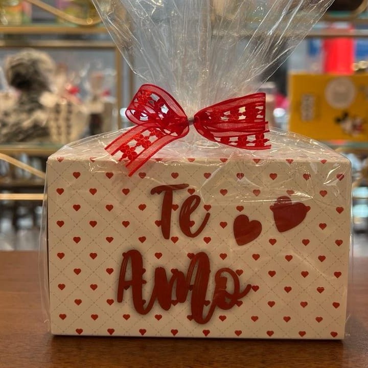 Cesta tamanho pequena com: 1 caixa de pão de mel com 6 unidades 210 g, 1 placa de chocolate ao leite escrito amo você 50 g, 1 coração de chocolate ao leite com drágeas de flocos 60 g, 2 tulipas de chocolate ao leite 14 g cada, 1 tudo de drágeas de flocos 110 g, 1 trufa cremosa de maracujá 30 g, 1 trufa cremosa tradicional 30 g e 1 trufa cremosa de coco 30 g.