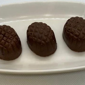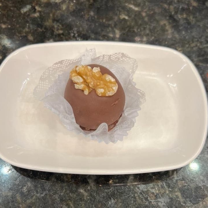 Docinho com massa de nozes coberto com chocolate ao leite, glaceado e é decorado com uma ¼ de noz