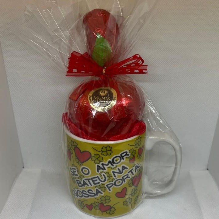 Caneca em porcelana sorte - Se o amor bateu na nossa porta, que sorte a nossa - contém : 1 coração de chocolate ao leite e 1 tulipa de chocolate ao leite.