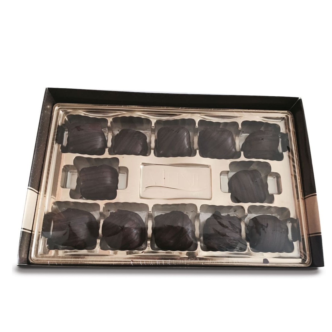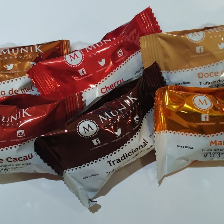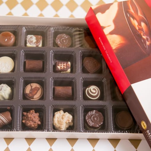 Caixa com 24 unidades de bombons sortidos de chocolate ao leite.