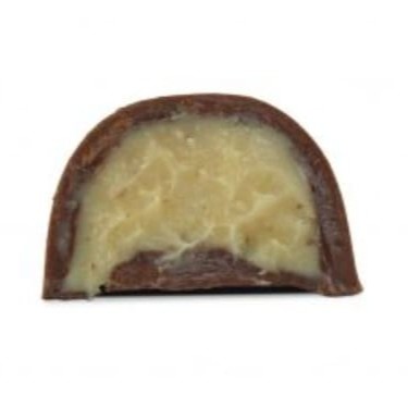 Bombom com uma camada de chocolate 50% amargo e com outra camada de creme de amêndoas, pacote com 100 g.