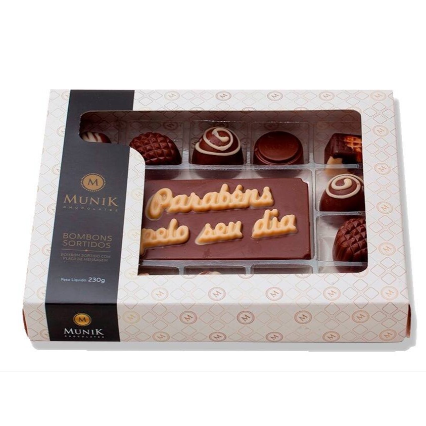 "Caixa de bombons sortidos c/placa de chocolate escrito ""parabéns pelo seu Dia"" - 230g"