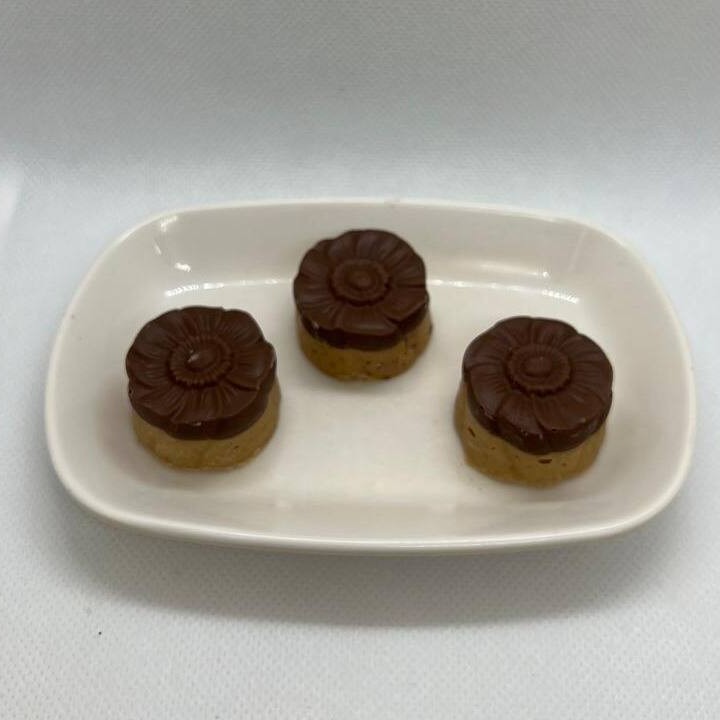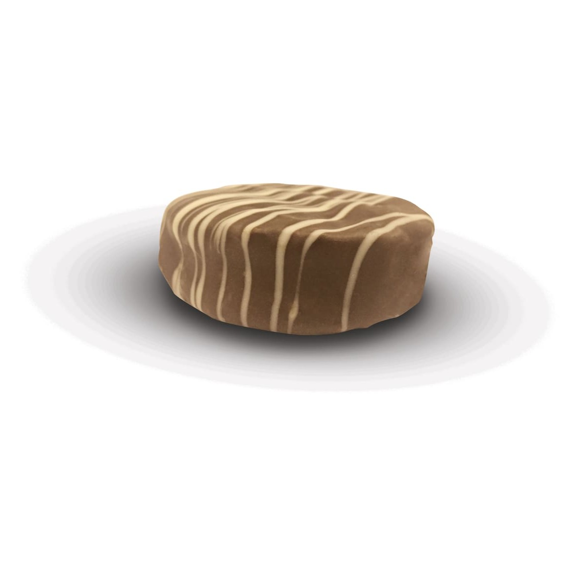 Biscoitos de coco cobertos com chocolate ao leite embrulhados individualmente.