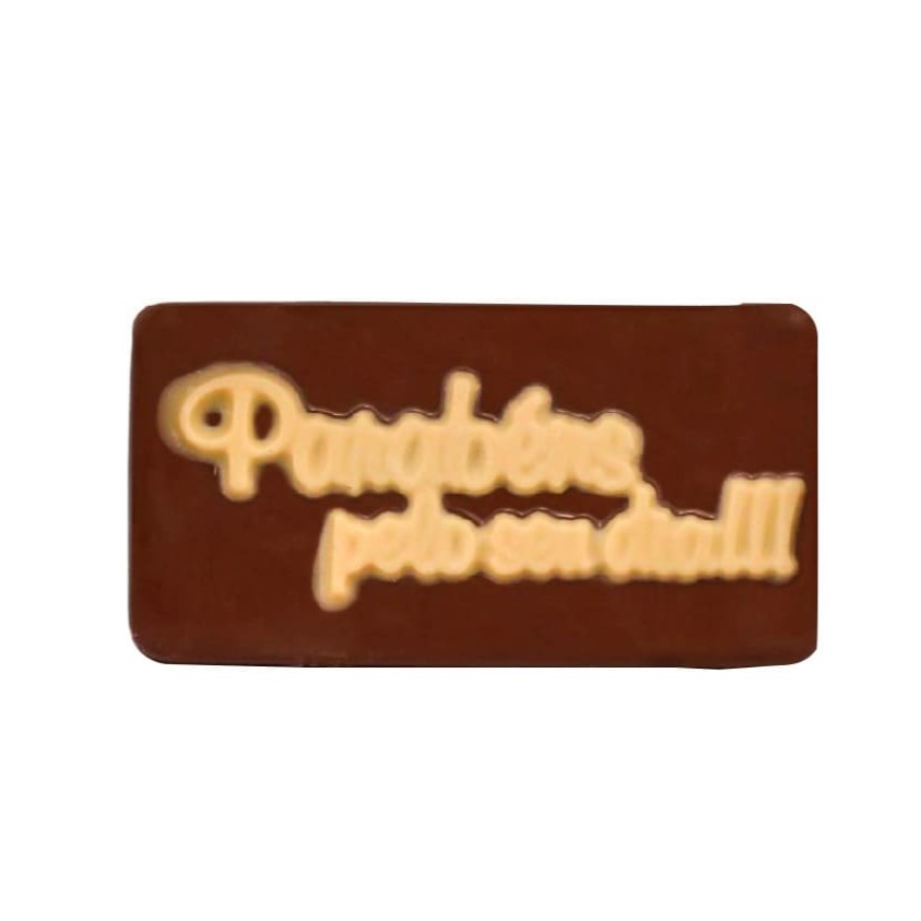 "Caixa com uma placa de chocolate ao leite com frase escrita em chocolate branco ""parabéns pelo seu Dia""."